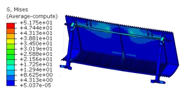 圖7 1000型鋁合金梯級前6階模態分析 1.5 梯級諧響應分析 根據梯級的國家標準,除了靜載荷試驗和模態分析以外,梯級還應進行動載荷試驗,模擬實際使用的工況,驗證梯級的實際性能。試驗應以5~20 Hz之間的任一頻率的無干擾的諧振力波,施加500~3 000 N之間的脈動載荷進行試驗,發現梯級不產生裂紋,踏面表面不產生4 mm變形。在ABAQUS軟件對梯級(結構3)進行諧響應分析,見圖8,20 Hz諧振力波時,梯級最大等效位移為0.64 mm,小于4 mm變形量,見圖9,最大等效應力為51.75 MPa,小于鋁合金A380的屈服強度160 MPa。通過諧響應分析,梯級動載荷下,滿足梯級的國家安全標準。