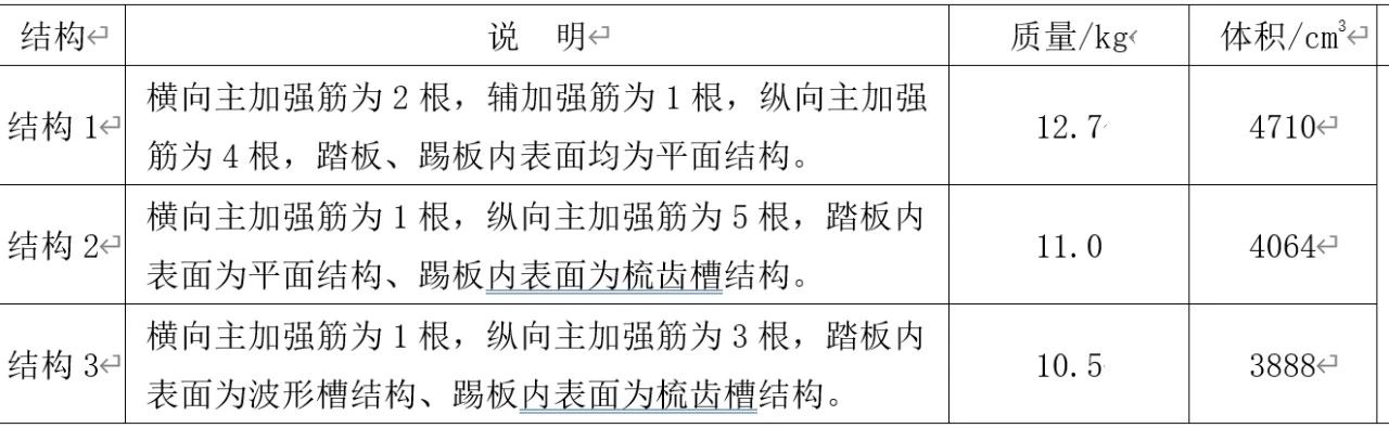 表1 A380化學成分及力學性能 1.2 梯級結構設計 在梯級結構設計中,既要考慮安全、技術要求符合國家標準,同時也要考慮整體式梯級的輕量化以及壓鑄工藝。梯級最大外形尺寸(長×寬×高)為1 009 mm×411 mm×340 mm,對3種不同的梯級結構設計進行分析比較,見圖2。 結構1:梯級壁厚為1.8 mm,橫向有2根主加強筋,筋板厚度為3.5 mm,高度為45 mm,長度為810 mm。同時為加強踏板的剛度,在踏板中間設計了一根小的加強筋??v向有4根主加強筋,筋板厚度為2 mm,見圖2a。 結構2:梯級壁厚為1.8 mm,橫向有1根主加強筋,筋板厚度為3 mm,高度為65 mm,長度為810 mm??v向有5根主加強筋,筋板厚度為2.5 mm,見圖2b。 結構3:梯級壁厚為1.8 mm,壁厚均勻,橫向筋板最小端壁厚為3 mm,高度為85 mm,長度為810 mm??v向有3根主加強筋,筋板厚度2mm,見圖2c。