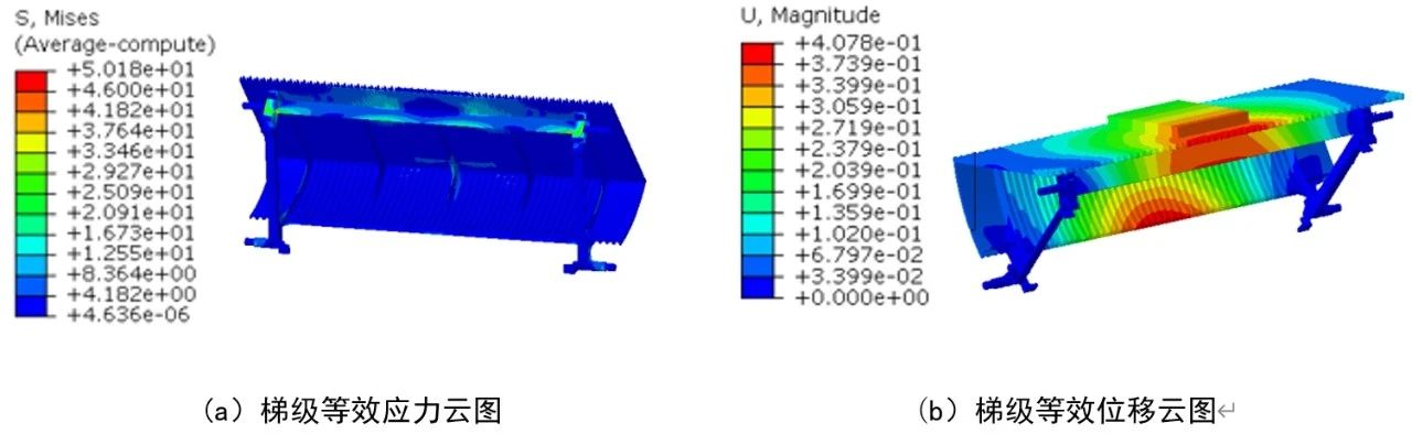 圖5 梯級結構2靜力學分析 (3)結構3:梯級的等效應力見圖6a,最大應力為49.20 MPa,發生在兩邊斜支架與踏面筋板交匯附近。梯級的等效位移見圖6b,最大位移為0.34 mm,發生在踏面邊緣的中間位置。