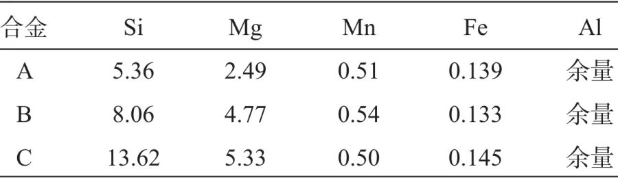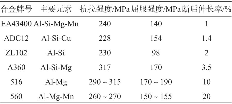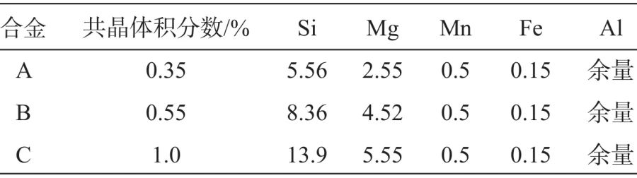 表1 工業(yè)常用壓鑄鋁合金鑄態(tài)性能 由于超細共晶組織能提高合金的強度和塑性,因此,近年來具有二元或者多元超細共晶或者亞共晶組織的研究得到廣泛的關注。目前超細共晶合金系列相對較少,例如TiNbCoCuAl合金,由于組織中存在超細共晶組織,其特定取向的共晶相阻礙位錯運動,提高合金強度及塑性。但對于壓鑄Al-Si合金,鑄態(tài)下屈服強度超過200 MPa仍然是一個挑戰(zhàn)。 1、試驗材料與方法 試驗所用原料有工業(yè)純Al(99.7%)、金屬Si(99.7%)、純Mg(99.9%)及Al-20Mn中間合金。首先將工業(yè)純Al表面油污及其他雜質(zhì)清洗去除烘干后,加入壓鑄機機邊爐(容量300 kg)中200 kg,壓鑄機型號為海天DC-300(普通冷式壓鑄機)。按照表2進行成分調(diào)配,熔煉溫度控制在(730±10)℃,待全部熔化后,靜置30 min,進行除氣精煉,石墨轉(zhuǎn)子轉(zhuǎn)速380 r/min,除氣時間15 min。采用SPECTROLAB M12直讀光譜儀測定合金成分,實際成分如表3。\