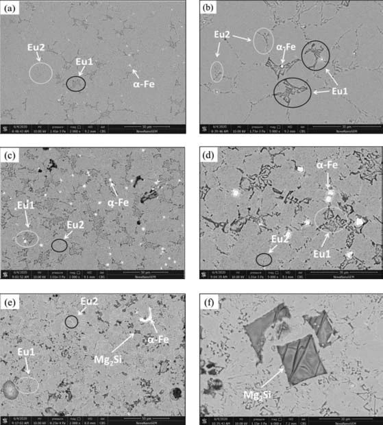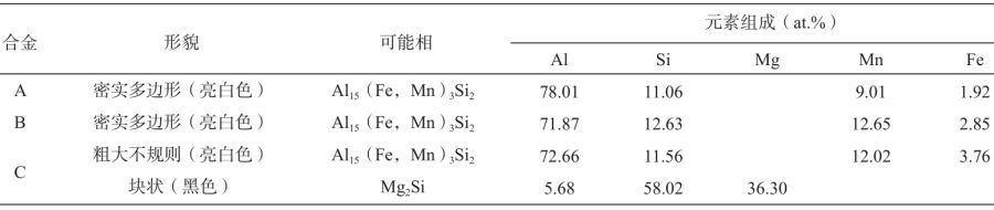 (a)、(b)合金A;(c)、(d)合金B(yǎng);(e)、(f)合金C 圖6 合金組織SEM-BSE圖 合金C中,如圖6e,并沒有發(fā)現(xiàn)許多彌散分布的細小α-AlFeMnSi相,僅有非常少的α-AlFeMnSi相,且呈粗大不規(guī)則狀,其長度約20 μm;同時在合金C組織中出現(xiàn)了大量的粗大的四方體Mg2 Si相,合金中不同中間相的平均化學成分如表5。圖6b、d中有兩種共晶組織,標注為Eu1和Eu2,合金A、B中這兩種共晶組織的形貌和大致尺寸基本相似,但合金B(yǎng)中的Eu1稍寬些。Eu1中含分枝狀的Mg2 Si,在合金A中其分枝間距約0.4~1.2 μm,而合金B(yǎng)中的Eu1分枝間距約0.7~3 μm。合金A和B的Eu2共晶體中包含了α-Al、Si、Mg2 Si以及針狀π-AlMnFeSiMg相。合金C中的Eu2和合金A、B中的形貌類似,但尺寸更加細小,如圖6e;與合金A、B不同的是,合金C中含有大量的密實塊狀Mg2 Si相,尺寸約15 μm左右,如圖6f。