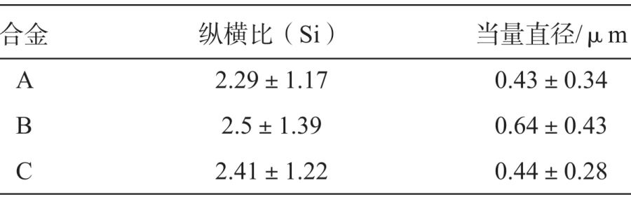 表5 合金中中間相的化學組成(SEM-EDS) 在Eu2共晶組織中有大量的共晶Si相,其形貌仍呈針狀,縱橫比及當量直徑如表6,可知其縱橫比相近。對比當量直徑,合金A中Si的當量直徑最小為(0.43±0.34)μm,而合金B(yǎng)中Si的當量直徑最大為(0.64±0.43)μm。在相同的冷卻條件下,本試驗合金中的共晶Si尺寸要比二元Al-Si合金中的共晶Si要細小得多。
