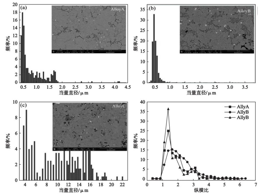 表6 合金A、B、C中Si顆粒的縱橫比及當量直徑 2.6?合金 A、B、C 中 α-AlFeMnSi 相尺寸分布 圖7是三種合金中α-AlFeMnSi顆粒的尺寸分布。合金A和B中的α-AlFeMnSi顆粒尺寸相對集中且非常細小,在0.5~1.5 μm之間;而合金C中α-AlFeMnSi顆粒尺寸較大且分布彌散,尺寸在4~18 μm之間。另外圖7d統(tǒng)計了α-AlFeMnSi顆粒的縱橫比,從統(tǒng)計結果可知合金B(yǎng)和C中的α-AlFeMnSi顆粒的縱橫比小于合金A。