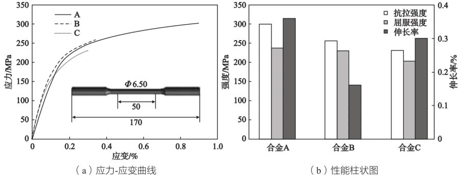圖7 合金中的α-AlFeMnSi相尺寸分布及α-AlFeMnSi相縱橫比-頻率分布曲線 2.7?拉伸性能分析 圖8a為壓鑄Al-Si-Mg-Mn合金的拉伸應力-應變曲線。三種合金的鑄態(tài)屈服強度均超過了200 MPa,但三種合金幾乎沒有塑性。圖8b是三種不同共晶體積分數(shù)的Al-Si-Mg合金的拉伸性能對比圖,合金A屈服強度達236 MPa,伸長率僅0.36%;合金B(yǎng)屈服強度229 MPa,伸長率約0.16%;合金C的屈服強度僅202 MPa,伸長率0.3%。相比表1中常見牌號的壓鑄鋁合金,此三種合金的屈服強度更高,且該合金中沒有其他合金元素,如Cu、Zn等強化元素。