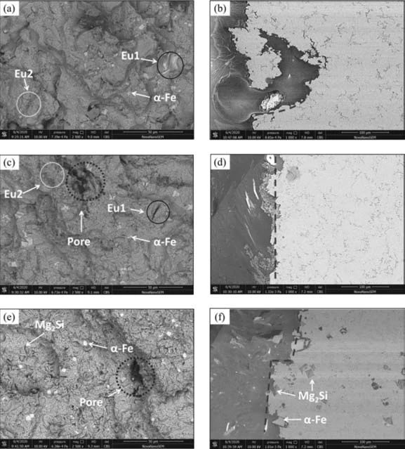 圖8 鑄造Al-Si-Mg-Mn合金拉伸性能 2.8?斷口形貌分析 圖9a、c、e分別是合金A、B、C的斷口中部形貌,圖中均可觀察到大量的亮白色α-AlFeMnSi相,從圖中還可以觀察到斷裂從初生相和共晶處開始。在合金B(yǎng)和C斷口中還有孔洞的存在,如圖9c、e。合金A和B在共晶區(qū)域發(fā)生了斷裂,如圖9b、d,而合金C除了在共晶區(qū)域斷裂,同時也在粗大的Mg2 Si顆粒上斷裂,如圖9f。同時值得指出的是,合金A的斷裂呈撕裂狀;而合金B(yǎng)和C則非常平滑,呈直線狀。