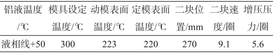 表3 合金實際化學成分 wB/% 合金成分測定合格后進行壓鑄試驗,壓鑄機噸位300 t,壓鑄時熔液溫度保持在液相線以上(50±5)℃。壓鑄機主要工藝參數(shù)如表4,壓鑄模具如圖1所示。