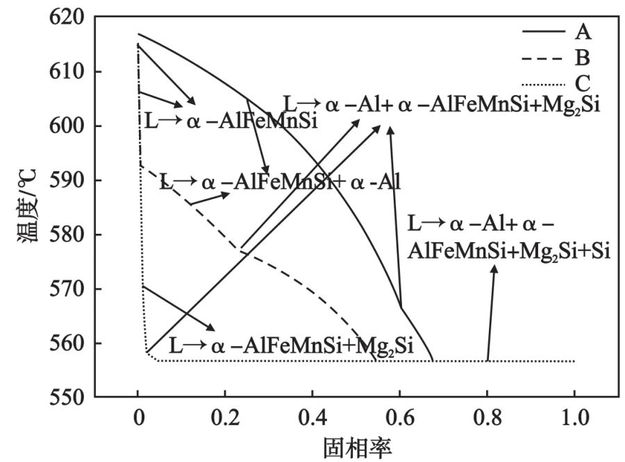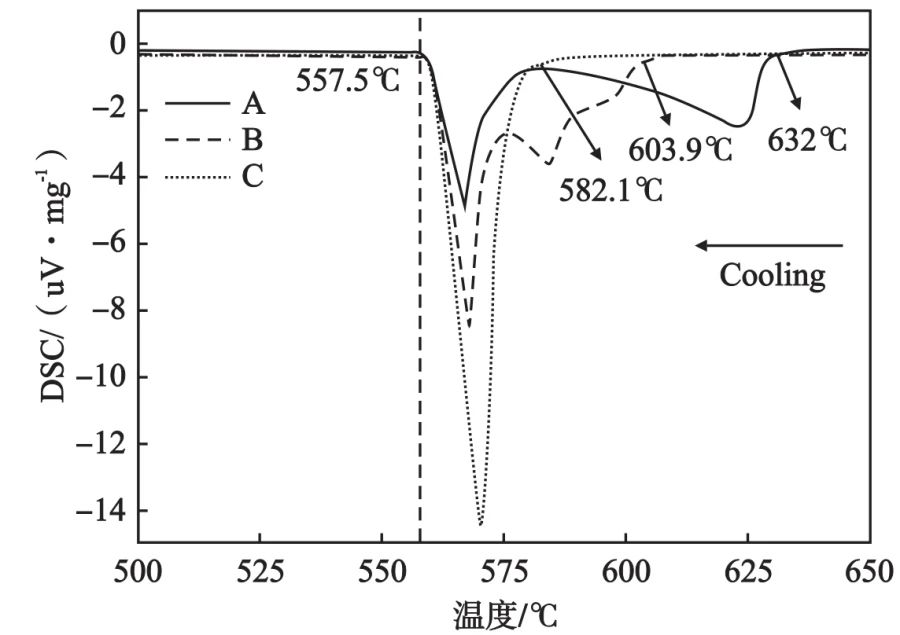 (a)、(b)合金A;(c)、(d)合金B(yǎng);(e)、(f)合金C 圖4 Al-Si-Mg-Mn合金組織演變 2.4?DSC 分析 圖5是合金A、B、C的DSC分析曲線。從圖中凝固曲線可分析得出最終凝固溫度在557.5 ℃,這與圖2中模擬計算的最近四元共晶反應的溫度相接近。合金A有兩個明顯吸熱峰,對應的是α-Al枝晶、三元共晶和四元共晶的形成,其中三元共晶反應和四元共晶反應非常接近。合金B(yǎng)則出現(xiàn)了三處吸熱峰,分別對應α-AlFeMnSi、二元共晶和三元共晶以及四元共晶反應。對于合金C,從DSC曲線只發(fā)現(xiàn)了一個峰值,這主要是共晶反應(包括二元、三元和四元反應)以及微量的α-AlFeMnSi,這和模擬分析相一致。這是由于DSC分析中冷卻速率非常慢,幾乎接近平衡凝固,因此一些中間化合物或者三元共晶反應會在最終共晶反應時析出。合金A具有最高的凝固溫度(632 ℃),而合金C則最低,僅582.1 ℃。