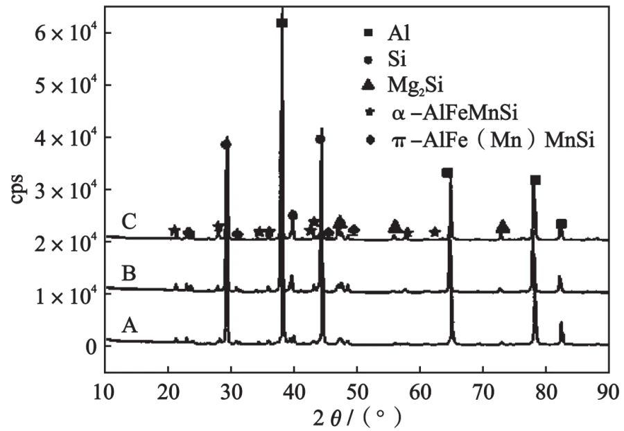 圖2 Al-Si-Mg-Mn合金凝固路徑模擬 隨著Mg和Si含量的改變,共晶體積分數(shù)由0.4到1.0。三種合金在凝固最終(約556.9 ℃)發(fā)生四元共晶反應:L→α-Al+α-AlFeMnSi+Mg 2 Si+Si。在發(fā)生三元L→α-Al+α-AlFeMnSi+Mg2 Si時,合金A由L→α-Al和L→α-Al+α-AlFeMnSi形成0.58的固相;合金B(yǎng)由L→α-AlFeMnSi和L→α-Al+α-AlFeMnSi反應形成0.22的固相;合金C中由L→α-AlFeMnSi和L→α-AlFeMnSi+Mg2 Si反應形成0.02的固相。三元反應結束時,三種合金的固相率分別為0.67、0.54、0.04。 2.2?XRD 分析 圖3是不同共晶體積分數(shù)的Al-Si-Mg-Mn合金XRD圖譜,分析得出主要的衍射峰相標定為α-Al、Si、Mg2 Si和α-AlFeMnSi相。值得指出的是,有些微小的峰為π-AlFe(Mn)MgSi相。