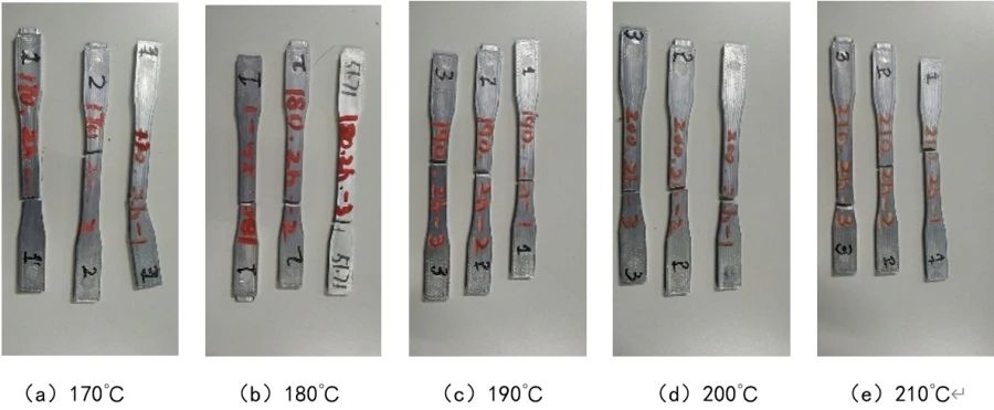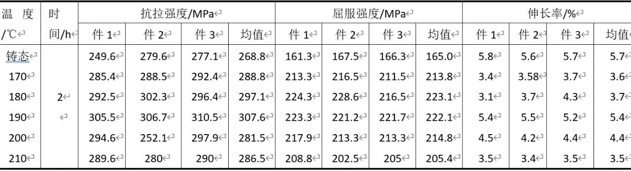 4、熱處理工藝效果 鋁合金鑄件熱處理目的是提高合金的力學性能,增強耐腐蝕性能,改善加工性能,獲得尺寸的穩(wěn)定性。鋁合金的時效硬化不僅決定于合金的組成、時效工藝,還取決于合金在生產過程中的缺陷,特別是空位、位錯的數(shù)量和分布等,目前普遍認為時效硬化是溶質原子偏聚形成硬化區(qū)的結果。AlSi10MnMg薄壁壓鑄零件在T5及T6的適當工藝參數(shù),都能得到較好的性能要求。由于固溶熱處理工藝較為復雜,并且較高的溫度容易導致薄壁壓鑄件變形超差,且薄壁該零件可以在2h可以得到均勻的溶解,因此以溫度為變量采用人工時效處理。 選取人工時效溫度范圍為170~210 ℃,每間隔10 ℃作為1組,保溫時間均為2 h。采用Sx2-12-6電阻爐進行人工時效,額定功率為12 kW,爐膛尺寸為550 mm×550 mm×450 mm;將每組3個試片懸掛放置入爐膛中間部位,通風,升溫15 min到達規(guī)定時效溫度,隨后自動保溫計時,最后由人工將試片取出空氣中冷卻。 使用WDW-50E萬能拉伸試驗機在室溫條件下進行拉伸測試,拉伸測試過程依據(jù)國標GB/T228.1-2010,見圖10,伸長率由卡尺測量拉伸前后數(shù)值計算獲得,每組3件,測試結果見表3。