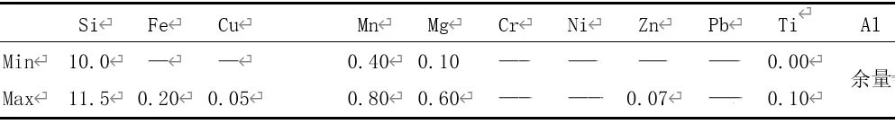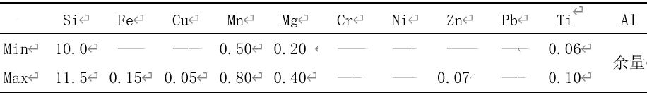 表1 AlSi10MnMg的化學成分 wb/% 由表1可知,標準中規(guī)定的AlSi10MnMg鋁合金中,Mg含量為0.1%~0.6%,范圍比較寬。吳樹森等研究發(fā)現(xiàn),Mg含量的增加與抗拉強度與屈服極限正相關,與伸長率負相關。過低的Mg不能產生足夠的強度,也不利于后續(xù)的熱處理,而過高的Mg能導致伸長率降低,Mg與Si形成Mg2Si強化相,使得α-Al固溶體結晶點陣發(fā)生畸變,從而起到強化合金的作用。Mg的含量為 0.20%~0.40%可以取得較好的綜合力學性能。 Fe是壓鑄鋁合金中一種有害元素,其以FeAl3和Al-Si-Fe的片狀或者針狀組織存在,降低合金的力學性能,F(xiàn)e含量要低于0.15%,Mn元素可以與Fe形成化合物,進一步消除鐵有害因素,同時Mn可以提高產品球狀結晶組織含量,將Mn含量保持為0.50%~0.80%。 適當增加Ti能顯著細化鋁合金的晶粒組織,提高合金的力學性能,降低合金熱裂紋傾向,故將Ti含量控制為0.06%~0.10%之間。由此,調整后壓鑄鋁合金的成分見表2。