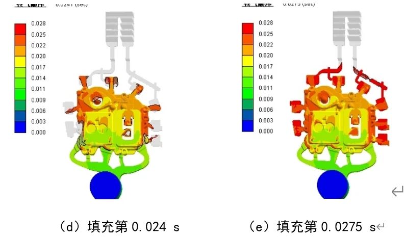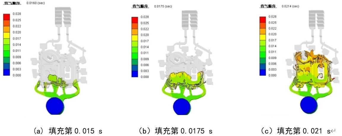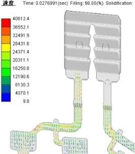 圖3 電池罩蓋填充卷氣模擬 圖4為填充0.277 s時的速度云圖。“π”型排氣波板是將一個傳統(tǒng)的排氣波板中間隔離,同時保留末端連通,一般左右兩邊隔離長度為4~5個牙扣,該結構既可以保證左右兩側氣體排出互不干擾,同時縮小空間,節(jié)省加工制造成本。從圖4可以看出,該時刻左側鋁液達到第一牙扣,右側即將抵達第一牙扣,使用粒子跟蹤技術測量左側前端速度為12 m/s,右側為1 3m/s,由于波板平均間隙為0.7 mm,兩股鋁液經過第一牙扣后速度迅速下降,到第二牙扣幾乎停止運動,鋁液最終停止的位置與鋁液粘度、模具溫度以及鑄造壓力等有關,設計左右兩側分別獨立4個牙扣,在第5~8個牙扣連通,實踐證明“π”型排氣波板設計合理,生產過程使用可靠。