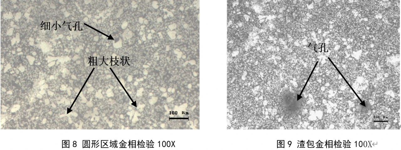 在產品3個重要區(qū)域取切片拋光并在10%燒堿溶液中腐蝕,使用AX10蔡司金相顯微鏡進行組織觀察,見圖8,白亮α鋁多數(shù)為塊狀或枝狀,晶粒尺寸較為粗大,個別尺寸大于80 um, 細小暗黑色Al-Si合金分布于α鋁周邊,較為均勻,但仍可見細小氣縮孔,孔隙率為3.5%。取圓孔內渣包進行金相檢驗,見圖9,發(fā)現(xiàn)有多個呈圓形黑色氣孔空洞,且周邊存在密集分布細小孔洞,經圖像識別測量,渣包內孔隙率為大于9%,說明該處渣包實現(xiàn)集氣及排渣的功能,氣體是在鋁液流動前端被高速卷入渣包,在高壓下被壓縮為孔洞。該現(xiàn)象與模擬分析結果基本一致,說明模具渣包設計較為合理。