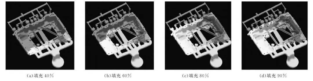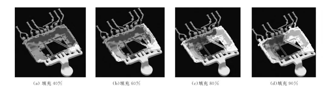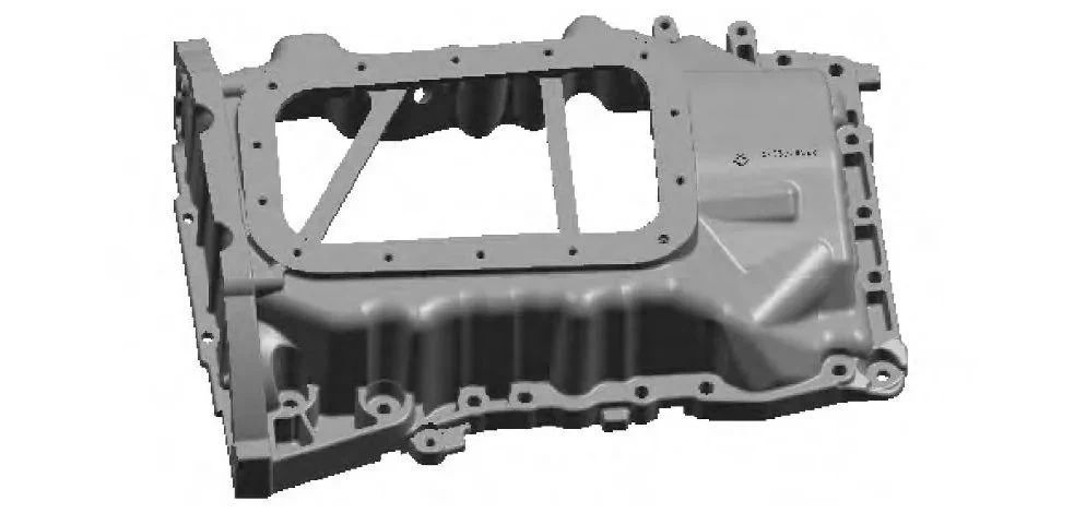 圖3 真空控制系統原理圖 為探討立體式激冷排氣閥的應用效果,選擇壓鑄油底殼零件進行試驗,產品結構 見圖4。其外形尺 寸為477.8mm×336mm×115.2mm,鑄件質量為4.1kg。該油底殼原采用普通的激冷排氣閥,其壓鑄工藝見圖5。如果由普通的激冷排氣閥改為立體式激冷排氣閥,需要對原方案的充型過程了解后,再對原方案進行優化,最終形成適合立體式激冷排氣閥的澆注系統以及排氣系統。對于原方案填充過程中鋁液的流動狀態進行分析,見圖6。
