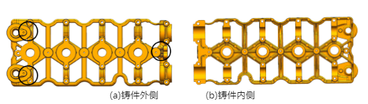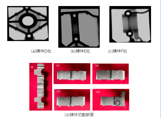 圖7 改進(jìn)方案縮孔仿真結(jié)果與試模鑄件 圖8 鑄件缺陷檢測(cè)X光探傷