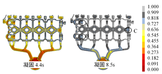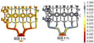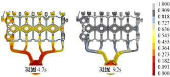 (b)凝固過程 圖6 改進(jìn)方案的充型過程和凝固過程