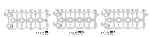 圖4 3種澆注系統(tǒng)方案的凝固過程 圖5 不同澆注方案下鑄件縮孔預(yù)測(cè)