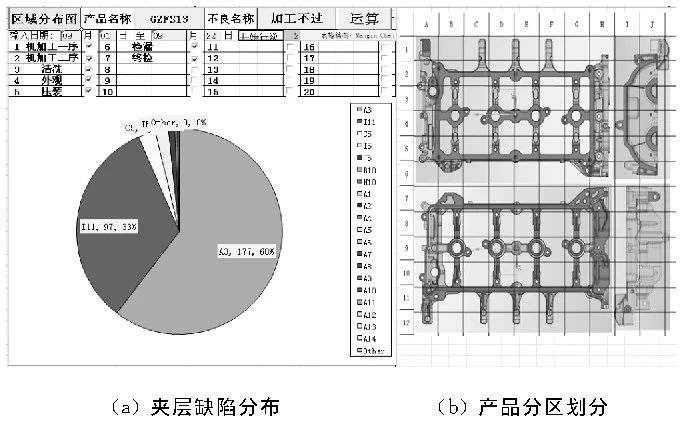圖8 產品分區劃分及加工后廢品缺陷分布 凸輪軸支架生產過程出現的問題主要見圖9:①產品填充末端油道孔附近氣孔,機加工后油道孔與墊片安裝面氣孔外露;②φ18mm傳感器孔由于結構設計原因,很容易在該位置形成氣縮孔,實際生產中該孔機加工后報廢率也很高;③產品填充末端墊片安裝面與鏈條蓋安裝面氣孔,機加工后氣孔外露嚴重;④鑄件飛料嚴重,披縫很厚,產品清理與模面清理困難;⑤入料口右側墊片安裝面夾層;⑥入料口M6螺紋孔夾層;⑦入料口左側墊片安裝面夾層;⑧油道孔加工不過。