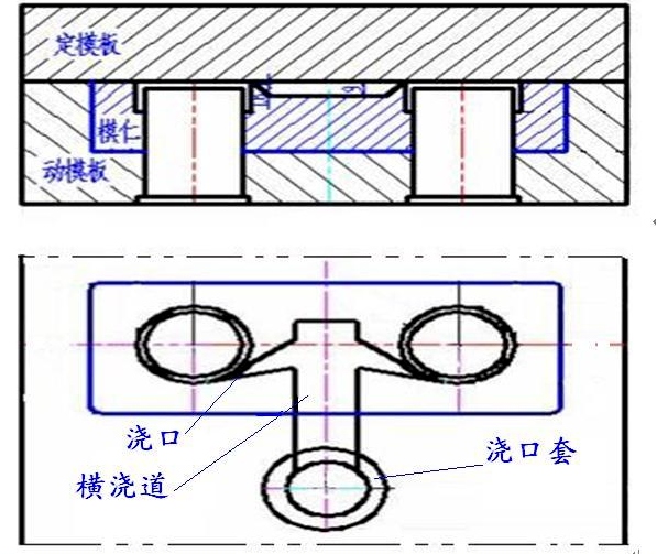 圖3 殼體分型面方案 (1)方案Ⅰ壓鑄模大型芯設在型芯固定板中,型腔和小型芯設在型腔板中,優(yōu)點是壓鑄件推出力小。缺點是壓鑄件2個φ6mm小孔與壓鑄件外圓φ56mm及內(nèi)孔φ48mm中心線的對稱度難以保證;壓鑄模分型面為壓鑄件下平面(裝配基準面),上有飛邊,無法確保尺寸20mm及16mm的精度(見圖1),顯然此方案壓鑄件品質(zhì)難以保證。 (2)方案Ⅱ壓鑄模一部分型腔和大型芯放在型芯固定板中,壓鑄模另一部分型腔和小型芯放在型腔板中。缺點是壓鑄件2個φ6mm與鑄件外圓φ56mm及內(nèi)孔φ48mm中心線的對稱度難以保證,壓鑄模分型面設在有外圓的平面上,人為造成壓鑄件外圓有飛邊,鑄件外觀質(zhì)量差。 (3)方案Ⅲ壓鑄模型腔和大型芯設在型腔板中,小型芯設在型芯固定板中。優(yōu)點是鑄件飛邊不在鑄件安裝基準面上。缺點是鑄件2個φ6mm小孔與鑄件外圓φ56mm及內(nèi)孔φ48mm中心線的對稱度有一定影響,但鑄件品質(zhì)基本能夠保證;以壓鑄件上平面做分型面,壓鑄件上平面上有飛邊。由于壓鑄件裝配時其飛邊被其他零件遮擋,故不影響鑄件在裝配后的外觀品質(zhì),此方案較為合理。 (4)方案Ⅳ壓鑄模型腔和大、小型芯全部設在動模。優(yōu)點是可確保鑄件2個φ6mm小孔與鑄件外圓φ56mm及內(nèi)孔φ48mm中心線的對稱度。缺點是分型面設在壓鑄件下平面(裝配基準)上,鑄件裝配基準面上有飛邊。此面為裝配基準面,不能有飛邊,故此方案不合理。 方案Ⅴ壓鑄模一部分型腔設在動模,另一部分型腔設在定模,大、小型芯全設在動模。優(yōu)點是可確保鑄件2個φ6mm小孔與內(nèi)孔φ48mm中心線的對稱度。缺點是不能確保壓鑄件2個φ6mm小孔與壓鑄件外圓φ56mm中心線的對稱度,且以φ5mm外圓面做分型面,人為造成壓鑄件外圓面上有飛邊,外觀品質(zhì)差。綜合上述分析,選擇方案Ⅲ,以殼體上平面作分型面。