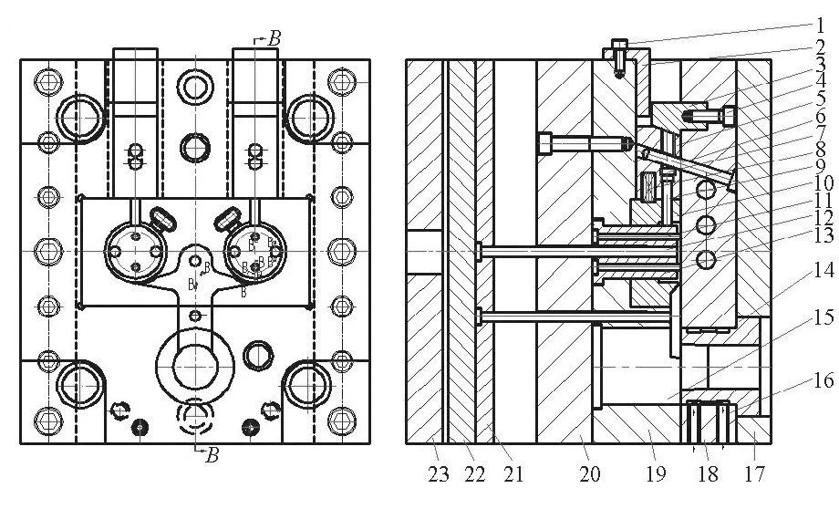 圖5 殼體壓鑄模裝配圖 1、4.內(nèi)六角螺釘 2.限位板 3.楔緊塊 5.滑塊 6.斜導柱 7.頂絲 8.彈簧 9.側(cè)型芯 10.動模模仁 11.小型芯 12.頂桿 13.大型芯 14.澆口套 15.分流錐 16.銅管 17.定模座板 18.定模板 19.動模板 20.支承板 21.推桿固定板 22.推板 23.動模座板