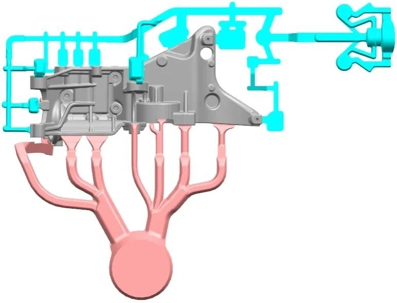 圖5 增加三角形減速機構(gòu)后機油冷卻器支架澆注排溢系統(tǒng)