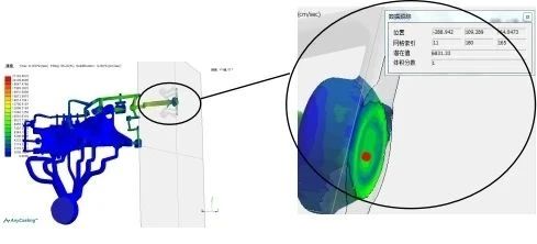 圖6 設(shè)置減速機構(gòu)后模擬分析速度檢測示意圖 通過在排氣道尾端增加減速結(jié)構(gòu), 能夠有效地削弱鋁液對真空閥的撞擊速度, 減小對真空閥的沖擊力, 解決真空閥閥芯尾部斷裂問題及真空閥堵塞問題, 從而提高機械式真空閥閥芯的使用壽命。