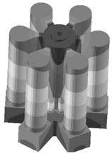 圖5 重力澆注工藝圖 重力澆注工藝模擬結果顯示,金屬液充型平穩,未見明顯紊流等異常現象,凝固順序較為理想,溫度場梯度均勻,實現自下而上凝固順序理念(圖6),疏松結果顯示鑄件部分未見明顯疏松區域(圖7),無孤立凝固相。分析認為,理論上工藝可行。方案工藝出品率約為55%。