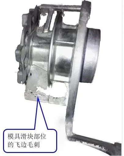 圖22 輪轂滑塊面毛刺 對策:方案一是鑄造壓力780 kgf/降低到540/,前提條件是必須進行產品的抗拉強度的CPK驗證,本案例驗證CPK合格。 方案二是降低模框的溫度:模具開始生產的前50模沒有飛邊毛刺,生產過程中??騋T50從常溫20 ℃升高到100 ℃左右,此時抗拉強度降低,??蜃冃瘟吭龃?。此時可考慮??蛴米詠硭档蜏囟鹊姆椒ā?/p>