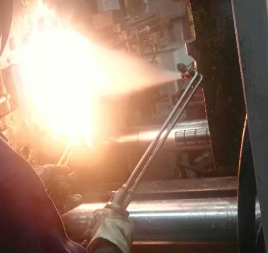 表1中,當鑄件頂出模具時,鑄件內部的溫度350 ~400 ℃時,對應模具溫度為280 ℃~300 ℃,此時材料為ADC12的鑄件和材料為8407系列模具鋼的公稱尺寸接近。經過測試模具和鑄件的溫度,以及統計生產中的模具的尺寸溫度變化,確定了表中合理的推薦值作為模具設計需要的參考數據。 案例一:壓鑄件在模具內頂出困難時采用烘烤鑄件升溫再頂出鑄件的原理: 當鑄件在模具內頂出困難時,最常用的現場處理問題的方法是在鑄件與模具的結合部位涂上一層油脂,然后用天然氣烘烤鑄件(圖9)往往能再次頂出鑄件。