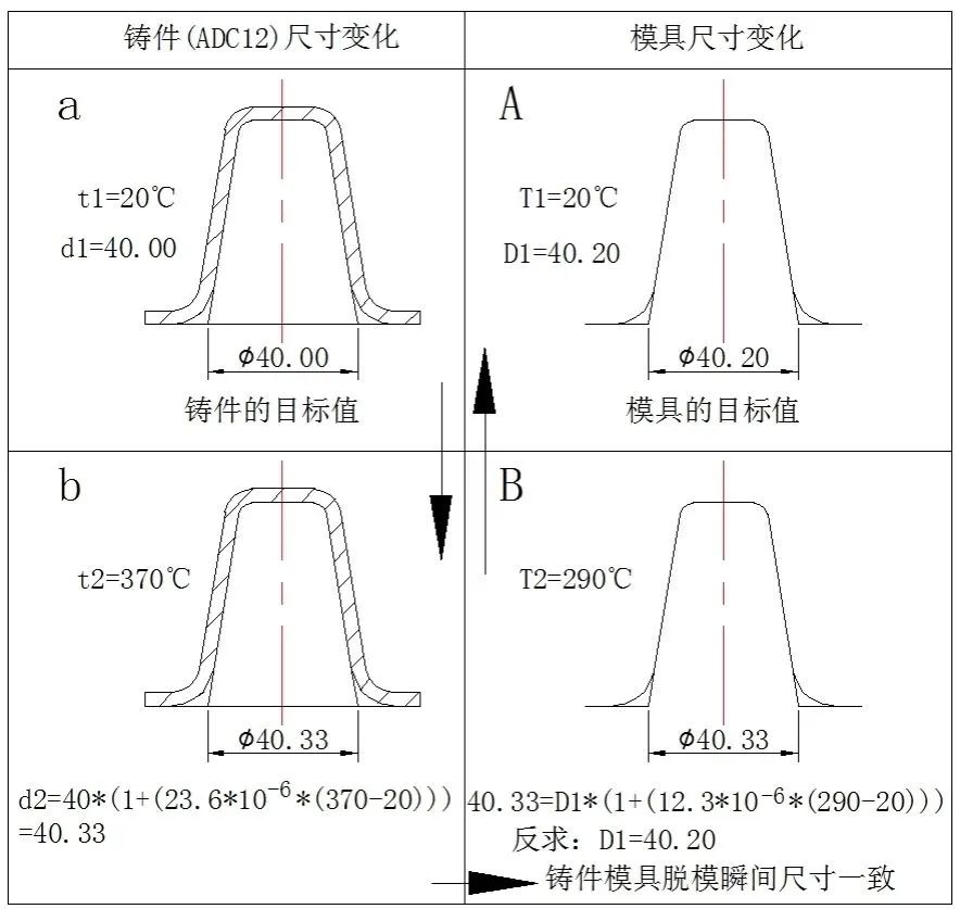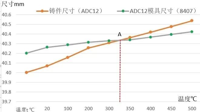 圖10 鑄件(公稱尺寸為40 mm時)與模具在不同溫度下的尺寸變化 根據表1做出鑄件公稱尺寸為40 mm時(其它尺寸斜率一樣)和模具隨溫度的變化關系曲線圖10,鑄件和模具的尺寸都會隨溫度的升高而升高,但是斜率不同,圖中的A點是鑄件和模具膨脹量等同時的交叉點,隨溫度的再升高,鑄件的尺寸>模具的尺寸。造成鑄件包模頂出困難的原因之一就是生產中的停頓使鑄件溫度下降到鑄件與模具尺寸等同的A點以下,鑄件的收縮使尺寸小于模具的尺寸造成包緊力更大。采用烘烤的方法使鑄件的溫度上升,熱膨脹量增加,甚至大于了模具的尺寸,使包緊力減小。在這個過程中可以采用一邊烘烤一邊嘗試頂出的方法,很多企業沒有條件也不需要進行溫度測試來等到條件符合才頂出,這種方法快速簡單有效。否則需要下模具由模具工剔除的方法,非常的費時費力。
