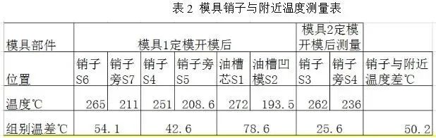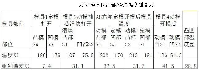 圖11 鑄件與模具尺寸對于溫度的變化過程 2模具設計的收縮率 壓鑄件一般情況下形狀復雜,尺寸多。在新產品設計可以直接套用經驗公式,如果在復制模情況下,應用大數據分析,鑄件在生產中尺寸超差有沒有規律性,在壓鑄工藝確定的情況下,尺寸超差的偏向性是一致的,比如長期偏大或者偏小,在復制模具時需要植入這個統計結果,對設計進行修正,也可以進行現有模具的修正。但要注意的是大數據分析時大時小的無規律波動就不能輕易修改模具,而要從工藝上讓該尺寸穩定下來后尋找對策。 3模具設計的配合間隙 模具設計時需要考慮模具的分型線分型面,銷子的對碰面,抽芯滑塊的配合面,凹凸模的配合面都需要設計合理的配合間隙,這在模具方面是產生飛邊毛刺的主要原因。 3.1 模具不同部位溫度測量 選擇四套模具分別測量模具的動模定模,凹凸部位,抽芯滑塊,銷子及周邊溫度,得到表2和表3的結果。