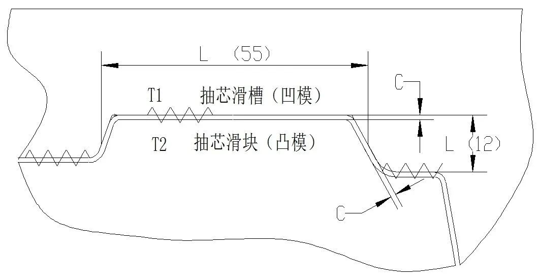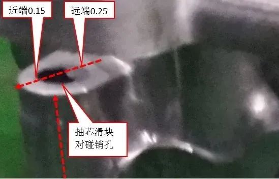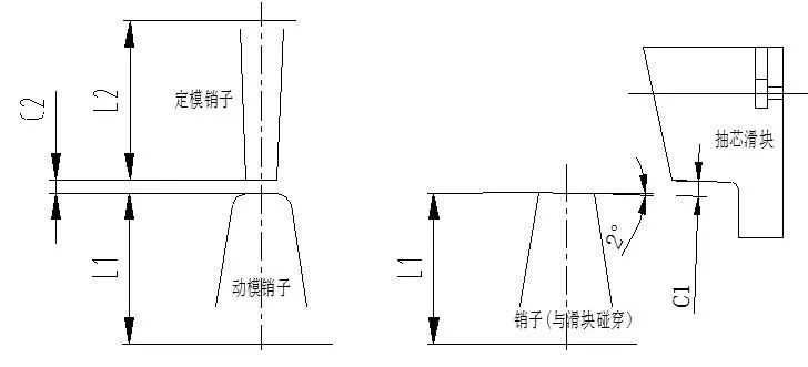 圖13 對碰銷配合間隙 圖14 抽芯滑塊碰穿銷配合間隙 (3)銷子與滑塊配合間隙 圖14中銷子與滑塊配合,一是要考慮銷子頂端與滑塊的出模斜度一致,銷子就需要防轉設計,同時還要設計銷子的間隙。由于滑塊在合模開模階段,抽芯滑塊的運動波動和制造精度±0.03 mm,凹凸面滑塊配合間隙,三者累計相加。