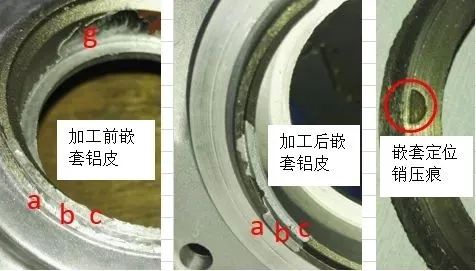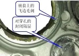 圖16 嵌套上毛刺 在模具設計的圖17中,其中嵌套的a~g段都是外露,h為三個均布的嵌套定位銷孔,嵌套的a段與模具壓緊。 嵌套與模具的有效的封水(封鋁液)面為嵌套的a面和內徑g面,這里的封水面就是防止鋁液進入到需要外露的嵌套部分。