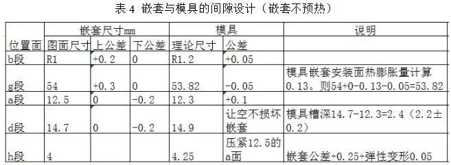 圖18 嵌套與模具的配合間隙設計(其中尺寸均為嵌套尺寸) 綜合嵌套的各面與模具的配合情況,形成案列的設計間隙標準表4。