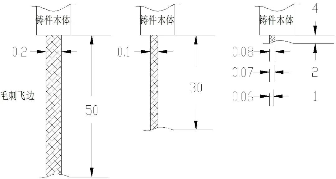 圖2 箱體嵌套毛刺 為了定義毛刺的厚度,在壓鑄模具上制作錐形模具間隙,見圖3,鋁材為ADC12進行最小壁厚的壓鑄驗證,在壁厚≥0.09 mm以上成形都較清晰,0.09 mm以下,0.06 mm以上成形不連續。 為了定義毛刺的長度,在壓鑄模具上制作模具分型面不同間隙進行毛刺長度的試驗,見圖4。當壁厚為0.08 mm時,從鑄件本體溢出的長度約為4 mm;當壁厚為0.07 mm,從鑄件本體溢出的長度約為2 mm;當壁厚為0.06 mm及以下時,從鑄件本體溢出的長度<1 mm,并且較難成形,鋁膜像粉狀存在,壓鑄件的拋丸處理完全能去除??偨Y以上試驗結果定義圖5的模具配合間隙標準。 定義1:壓鑄模具生產時的間隙C≤0.06 mm 為無飛邊毛刺的模具設計制造標準