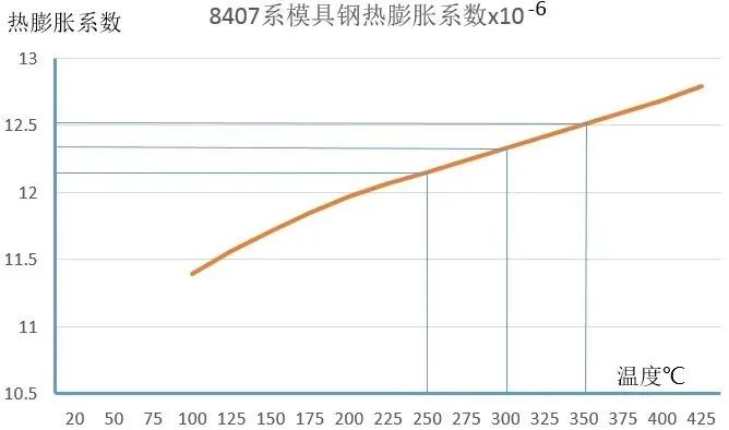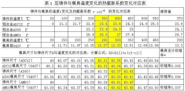 圖5 壓鑄模具分型面及抽芯滑塊間隙 本文從模具設計的收縮率,強度設計,配合間隙及制造精度方面進行研究和驗證。試驗條件:東芝800T壓鑄機,鋁材ADC12,鋁液溫度640 ℃,鑄造壓力660 kgf/,模具材料8407系。 1壓鑄模的熱膨脹 壓鑄件從模具中頂出時處于高溫狀態,然后冷卻至室溫產生收縮。模具設計時,先完成鑄件的3D后確定鑄件的收縮率。一般資料推薦是0.4~0.7,對于模具設計者需要針對不同的鋁合金選擇相應的收縮率。 1.1 金屬材料的熱膨脹系數 壓鑄過程中涉及到的金屬熱膨脹系數就是模具鋼和壓鑄材料兩種。壓鑄模具材料常用8407,DIEVAR,H13,SKD61等都歸類為8407系金屬材料。對于鋁合金壓鑄,模具預熱后的正常生產時的模具溫度范圍在75~425 ℃之間。根據模具的使用溫度選擇對應的模具熱膨脹系數(圖6)。不同的壓鑄企業模具使用時溫度存在差異,企業需要根據大數據進行統計確認。