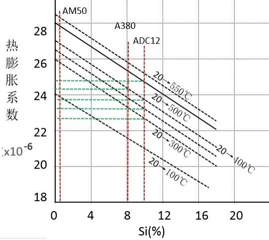 圖6 金屬材料8407模具鋼的熱膨脹系數 壓鑄鋁合金鎂合金的熱膨脹系數主要是和Si的含量有關,同一溫度情況下Si的含量越高,熱膨脹系數越小。圖7為3種常用壓鑄材料ADC12,A380,AM50的熱膨脹系數,對應牌號豎線是該材料成分需求的中值。壓鑄廠家可以根據自己公司的常用Si含量進行查詢。