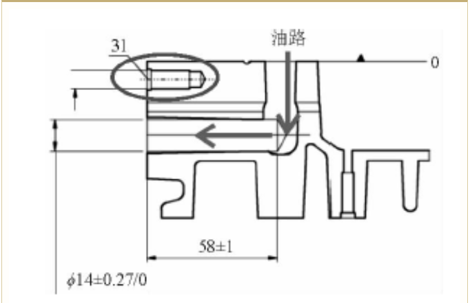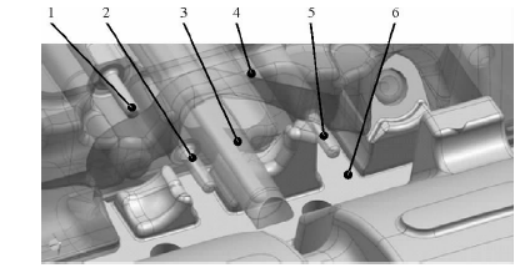 圖3缸體群架壓鑄模結構圖(動模) 2.批量生產中的問題及原因分析 生產過程中,鑄件經加工后密封測試,發現在機濾安裝面M6螺紋孔出現微泄露,泄漏位置見圖4,廢品率達8.3%。對泄漏零件進行X光檢驗,發現鑄件內部有縮孔和縮松。對缺陷部位進行剖切,發現毛坯孔壁有過熱粘料。泄漏產生的原因是內部存在縮孔和縮松,機加工后內部細小縮孔將油道孔與螺栓孔貫通,導致油道在加壓到0.3 MPa時泄漏量大于10 mL/min。