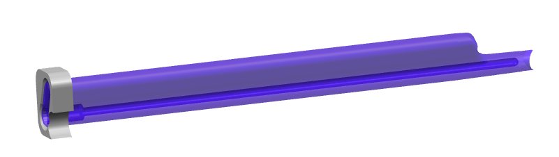 圖5 左滑塊優化方案結構圖 異型部位采用鑲件結構,內部加設Φ7 mm冷卻水道。采用噴管式獨立水冷卻,內置不銹鋼噴管Φ4 mm,內孔進水,外壁回水,見圖6。