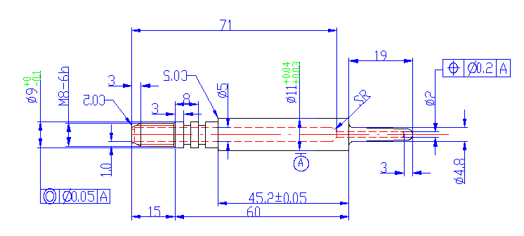 圖6 左滑塊異型鑲件 小細型芯加設冷卻水,對型芯進行強制冷卻。型芯采用螺紋與后端的型芯噴管總成連接,采用耐高溫O型密封圈進行密封,可以實現不拆模具進行快速更換。型芯前端用電火花打孔機打直徑Φ2 mm的水道孔。型芯采用噴管式獨立水冷卻,內置不銹鋼噴管Φ1.2 mm,內孔進水,外壁回水。結構圖見圖7。