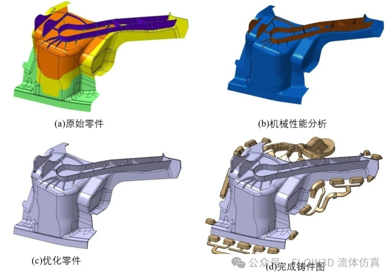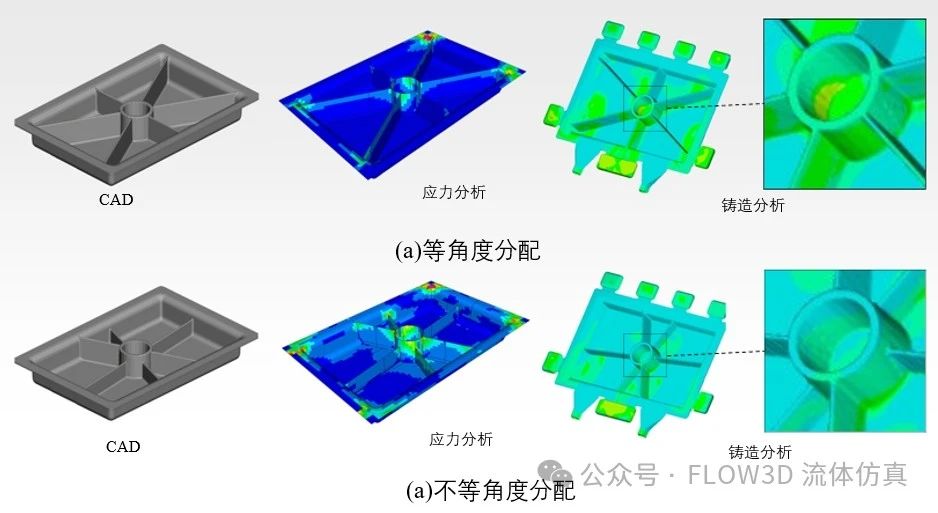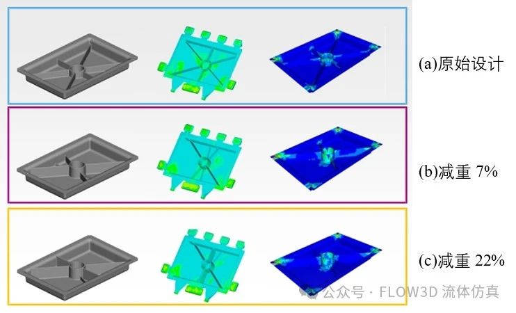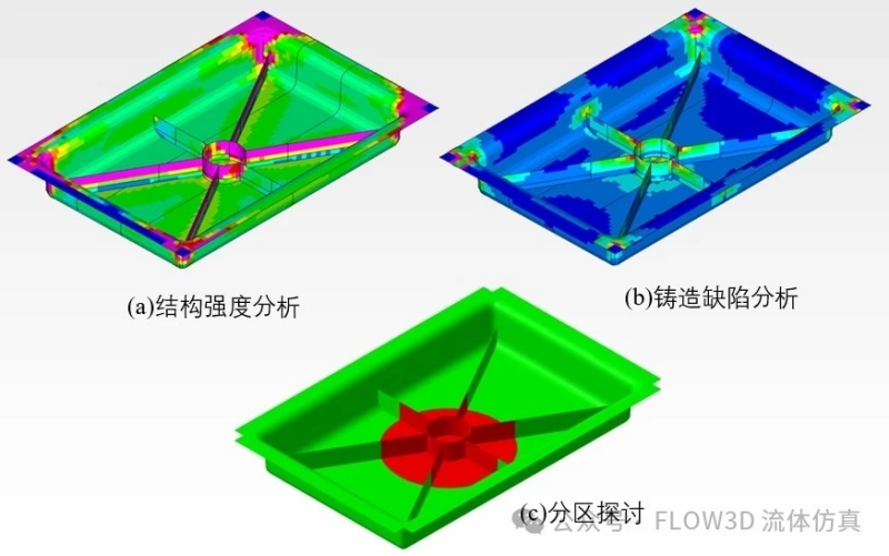圖7 零件優(yōu)化流程 四、研究結果 基礎模模型研究主要是探討筋的角度、數(shù)量及高度,由圖8的分析結果可以看到等角度分配的筋在壓鑄時有卷氣存在,由圖9的分析結果可以看到減重22%仍然可以達到一定要求的機械強度,并且鑄造時無明顯缺陷存在。