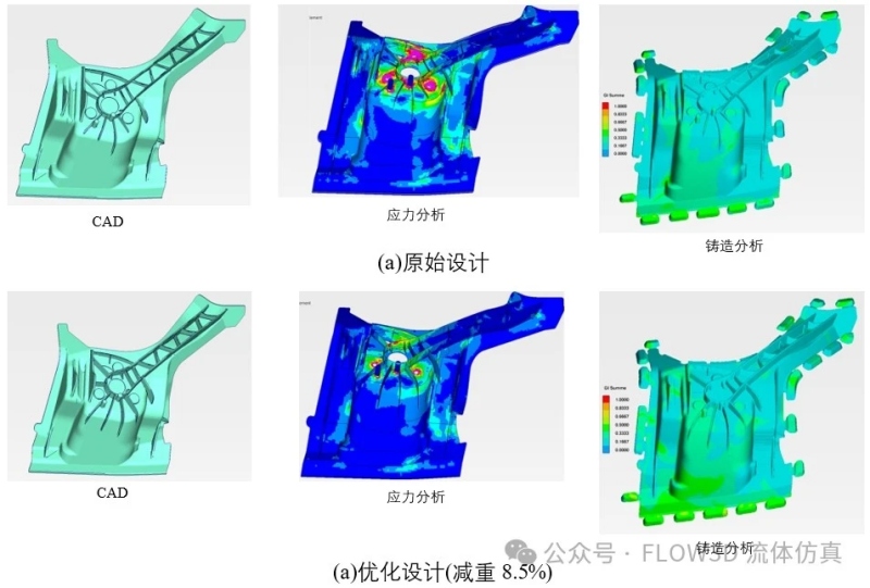 圖9 基礎模型不同減重比率的分析結果 依據(jù)基礎模型的研究結果進行鑄件的優(yōu)化,由圖10可看出原始設計在荷重時有應力集中的現(xiàn)象,經過筋條的優(yōu)化后有明顯的改善,最終減重了8.5%仍然有高強度的機械性能及良好的鑄造性。