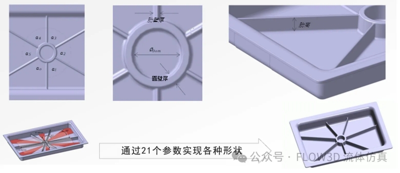 圖5 Panamera G1 的車殼 三、分析設置 通過前章節(jié)的流程進行基礎模型的研究(如圖6),將零件通過應力分析軟件計算出機械性能并分區(qū)檢視筋的效應整理出規(guī)則,應用于實際零件中,再繪制流道及渣包完成鑄件本體,后續(xù)通過FLOW-3D進行充型及凝固的模擬,通過卷氣、氧化物、縮孔…等缺陷判斷來進行優(yōu)化。