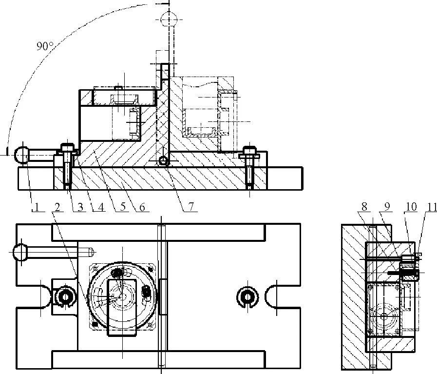 圖3 帶減速箱端蓋銑床夾具 為滿足與軸承和定子的裝配要求,需將所獲壓鑄件進(jìn)行必要的后續(xù)加工處理,以便兩處軸承室和止口尺寸車削或銑削至精度和形位公差達(dá)到要求,但由于端蓋形狀的特殊性,致使車削加工時(shí)即使有車夾具支持也無法實(shí)現(xiàn)一次裝夾完成兩個(gè)空間正交軸承孔的加工,因此,考慮采用銑夾具來解決上述問題,見圖3。 夾具體5(見圖4)置于底座6之上,繞轉(zhuǎn)軸7在0°~90°之間翻轉(zhuǎn),并且0°和90°是兩個(gè)工作位置,手柄與夾具體插孔采用間隙配合以便完成插入翻轉(zhuǎn)后立即拔出(否則會(huì)妨礙銑削加工),同時(shí)夾具體5的一個(gè)固定槽剛好穿過底座上的夾具體鎖緊螺釘3,在固定槽和夾具體鎖緊螺釘3的頭部之間插入開口墊片4,再擰緊螺釘3即限制了夾具體最后一個(gè)轉(zhuǎn)動(dòng)自由度。基于壓鑄件尺寸一致性程度高的特點(diǎn),端蓋鑄件在夾具體采用一面兩銷定位,即利用端蓋4-?5mm安裝孔中的2個(gè)對(duì)角孔分別套入一個(gè)定位圓銷2和一個(gè)菱形銷11。當(dāng)轉(zhuǎn)位壓塊10轉(zhuǎn)至指定位置時(shí)只需旋緊壓塊螺釘8即可鎖緊端蓋零件。