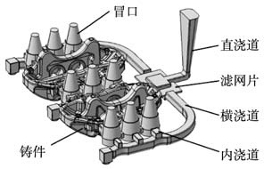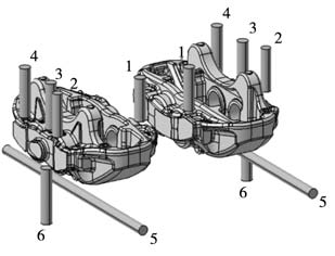 表6 優(yōu)化方案結(jié)果對(duì)比 依據(jù)最優(yōu)工藝方案進(jìn)行生產(chǎn)試制,得到圖5所示的含澆注系統(tǒng)的制動(dòng)鉗鑄件成品,可見在此金屬型重力鑄造工藝方案下能夠得到充型完整且表面光潔的鑄件。經(jīng)檢驗(yàn),制動(dòng)鉗鑄件成形質(zhì)量較高,沒有縮松縮孔缺陷,符合預(yù)期效果,從而驗(yàn)證了此優(yōu)化工藝方案的可行性。