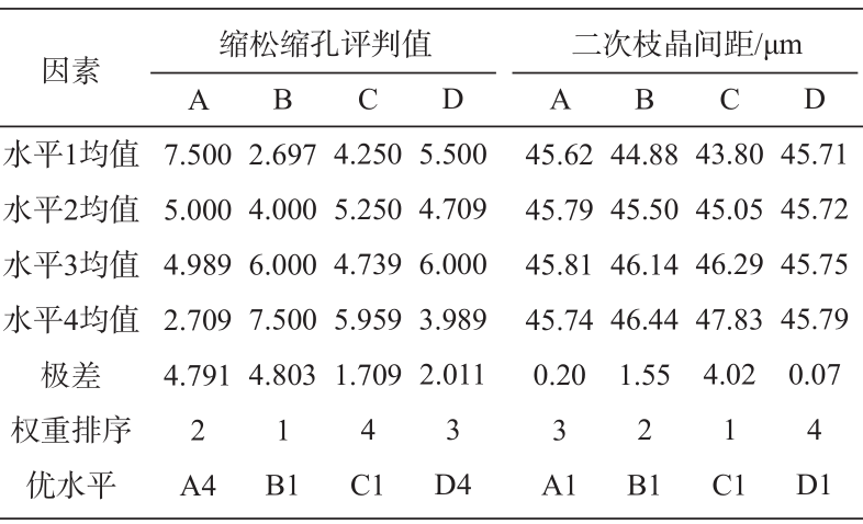 表4 正交試驗(yàn)結(jié)果 2.3 工藝參數(shù)對(duì)評(píng)價(jià)指標(biāo)的影響 為了揭示各因素對(duì)評(píng)價(jià)指標(biāo)的影響規(guī)律,并確定各因素的優(yōu)水平,基于正交試驗(yàn)的結(jié)果,進(jìn)行均值和極差分析,結(jié)果如表5所示。 根據(jù)表5均值與極差分析的結(jié)果,縮松縮孔評(píng)判值隨著澆注時(shí)間的增加而減小,隨著澆注溫度的升高而增大,而隨著模具預(yù)熱溫度和冷卻水溫度的變化呈現(xiàn)出波動(dòng)變化,各因素對(duì)縮松縮孔缺陷的影響權(quán)重排序?yàn)椋簼沧囟龋緷沧r(shí)間>冷卻水溫度>模具預(yù)熱溫度。二次枝晶間距隨著澆注時(shí)間的增加而先增大后減小,隨著澆注溫度和模具預(yù)熱溫度以及冷卻水溫度的升高而增大,各因素對(duì)二次枝晶間距影響權(quán)重的排序?yàn)槟>哳A(yù)熱溫度>澆注溫度>澆注時(shí)間>冷卻水溫度。