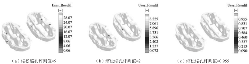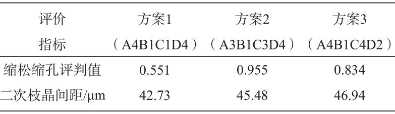 表5 均值和極差分析表 2.4 優(yōu)化方案的確定及試制驗(yàn)證 基于對(duì)上述工藝參數(shù)對(duì)評(píng)價(jià)指標(biāo)的影響規(guī)律分析,確定的優(yōu)化方案如下: (1)縮松縮孔缺陷是實(shí)際鑄件生產(chǎn)過程中首先需解決的鑄造缺陷,工藝方案應(yīng)首先保證鑄件中無縮松縮孔缺陷,使縮松縮孔評(píng)判值最小的工藝組合方案為A4B1C1D4。在確保鑄件沒有縮松縮孔缺陷的同時(shí),二次枝晶間距應(yīng)當(dāng)越小越好,以提高鑄件的力學(xué)性能。根據(jù)極差分析的結(jié)果,模具預(yù)熱溫度對(duì)二次枝晶間距的影響最大,而對(duì)縮松縮孔評(píng)判值的影響最小。由于模具預(yù)熱溫度對(duì)減小二次枝晶間距和縮松縮孔缺陷的最優(yōu)水平均為C1,因此可將工藝參數(shù)組合A4B1C1D4作為第一組優(yōu)化方案。(2)正交試驗(yàn)的結(jié)果中有兩組工藝參數(shù)組合沒有縮松縮孔缺陷,分別是第9組(A3B1C3D4)和第13組(A4B1C4D2),因此可將該兩組的工藝方案分別作為第二組和第三組優(yōu)化方案進(jìn)行比較。 上述的優(yōu)化方案數(shù)值模擬的結(jié)果如表6所示。3個(gè)優(yōu)化方案的縮松縮孔評(píng)判值均小于1,即均不發(fā)生縮松縮孔缺陷。其中方案1的縮松縮孔評(píng)判值最小,且對(duì)應(yīng)的二次枝晶間距也最小,因此,綜合上述分析,將方案1(A4B1C1D4)作為最優(yōu)工藝方案,即澆注時(shí)間為28 s,澆注溫度為 700 ℃,模具預(yù)熱溫度為300℃,冷卻水溫度為 35℃。