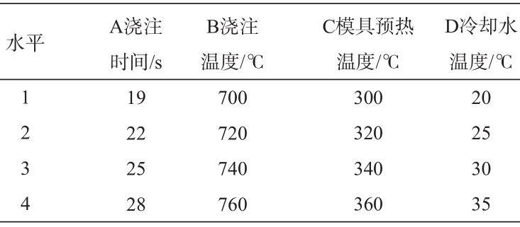 圖3 冷卻系統(tǒng) 2.2 基于正交試驗(yàn)的工藝參數(shù)優(yōu)化 在原始工藝方案基礎(chǔ)上添加冷卻措施后,利用正交試驗(yàn)設(shè)計(jì)進(jìn)行工藝參數(shù)的多目標(biāo)優(yōu)化。根據(jù)經(jīng)驗(yàn),澆注時(shí)間、澆注溫度、模具預(yù)熱溫度和冷卻水溫度是金屬型重力鑄造工藝的重要參數(shù),對(duì)鑄件成形質(zhì)量有顯著影響,因此選取上述4個(gè)因素作為優(yōu)化參數(shù),并對(duì)每個(gè)因素在合適范圍內(nèi)設(shè)置4個(gè)水平,得到如表3所示的正交試驗(yàn)因素水平表,采用正交表L16(44)進(jìn)行試驗(yàn)方案設(shè)計(jì)。