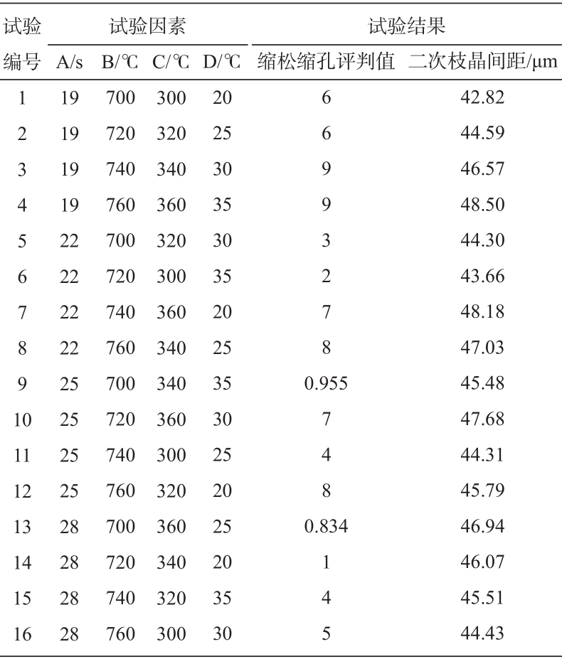 表3 正交試驗(yàn)的因素和水平 本文以縮松縮孔缺陷和二次枝晶間距作為對(duì)鑄件質(zhì)量的評(píng)價(jià)指標(biāo)。縮松縮孔缺陷是制動(dòng)鉗鑄件主要的內(nèi)部缺陷,其直接影響鑄件的力學(xué)性能和疲勞壽命。本文縮松縮孔缺陷的評(píng)判值是在考慮局部溫度梯度和冷卻速度的基礎(chǔ)上,引入局部凝固時(shí)間的適用于預(yù)測(cè)鋁合金鑄件中的縮松縮孔缺陷的判據(jù)式: