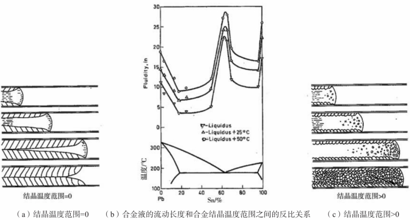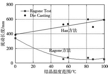 圖2 Ragone試驗法和Han試驗法制備的壓鑄件 2 試驗結果及分析 2.1 流動性和合金間隔的關系 用表1所列合金實測了兩種鑄造條件下的流動長度,所測得的流動長度和合金的結晶溫度范圍之間的關系見圖3。用Ragone方法獲得的試驗數據,呈現出合金流動性和合金結晶溫度范圍之間的反比關系,與圖1所示的著名試驗結果一致。試驗結果表明,在重力鑄造條件下,麻省理工的流頭阻塞理論,不僅適用于如圖1所示的二組元合金,也適用于多組元商業合金。 然而,圖1所示的壓鑄條件下的流動性和結晶溫度范圍的規律與重力鑄造條件下的規律完全相反。使用Han方法所獲得的壓鑄條件下試驗數據如圖3所示,合金的流動性隨合金的結晶溫度范圍增加而增加,這一趨勢與重力鑄造條件下的趨勢完全不同。例如,純鋁(結晶溫度范圍等于0)在重力鑄造條件下的流動性應該優于結晶溫度范圍大于0的合金,但在壓鑄條件下,其流動性反而低于結晶溫度范圍大于0的合金。為此,圖3所示的試驗結果預示著壓鑄條件下金屬液充型流動的停止機理與重力鑄造條件下的流動停止機理存在不同之處。
