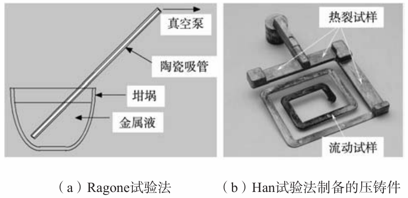 表2 試驗合金的液相線和固相線溫度,結晶溫度范圍和澆注溫度 1.2 流動性測試方法 使用了兩種方法測試合金的流動性。第一種是麻省理工開發的Ragone方法,見圖2a。合金液在表2給定的溫度下吸入內徑4 mm室溫陶瓷管,真空泵的壓力控制在82 cm水柱。陶瓷吸管的水平度對試驗結果影響不大。詳細的Ragone試驗方法參見麻省理工已發表的文獻。Ragone方法被認為是在重力鑄造條件下研究合金流動性的最精確的方法。 第二種是作者在橡樹嶺實驗室開發的Han方法。作者使用一臺128 t鎖緊力的壓鑄機,用H13鋼模具制備如圖2b所示的壓鑄件。模溫130 ℃,壓室內徑5.08 cm,壓頭最高速度254 cm/s,最大壓強13.8 MPa。詳細的壓鑄試驗條件參見作者已發表的文獻。鑄件由三段熱裂試樣和一段回形流動性試樣組成,可同時用于測定合金的熱裂傾向和流動性。熱裂試樣厚6 mm,寬32 mm,長分別為57 mm,76 mm,127 mm。回形流動性試樣厚1 mm,寬15 mm,長914 mm。熱裂試樣可視為壓鑄件的橫澆道,流動性試樣的入口可視為壓鑄件的內澆道。回形的邊長隨合金液的充型流動而遞減。這樣的流動性試樣設計,使壓鑄條件下離散的流頭液滴獲得一定的形狀規范,從而減小離散流頭液滴由于與主流充型液流分離而帶來的流動長度測量誤差。然而,即使使用這樣的回形流動試樣,凝固后的流頭仍然極易在鑄件脫模時從鑄件本體脫落而成為碎片,帶來一定的試驗誤差。 1.3 壓室中的凝固組織模擬 在圖2b所示的熱裂試樣和流動試樣中,往往含有部分在壓室中形成的枝晶組織。為區別壓室內形成的枝晶組織和鑄型內形成的組織,選用A380鋁合金,在表2中的過熱度條件下,澆入與壓室內徑相同的鋼管,開展了兩個凝固試驗,以揭示壓鑄條件下合金液流動停止機理。第一個是合金液自然凝固,以確定合金的二次枝晶臂間距。第二個是合金液在高強超聲攪拌作用條件下的凝固,近似模擬金屬液在壓室中受到強制擾動時破碎枝晶的形貌。詳細的試驗條件參見作者已發表的文獻。